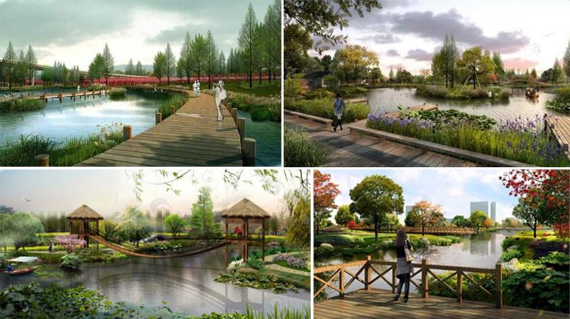 以荷花為主題,堤岸打造木棧道,河岸搭配蘆葦等植物,充分發揮綠地效益。